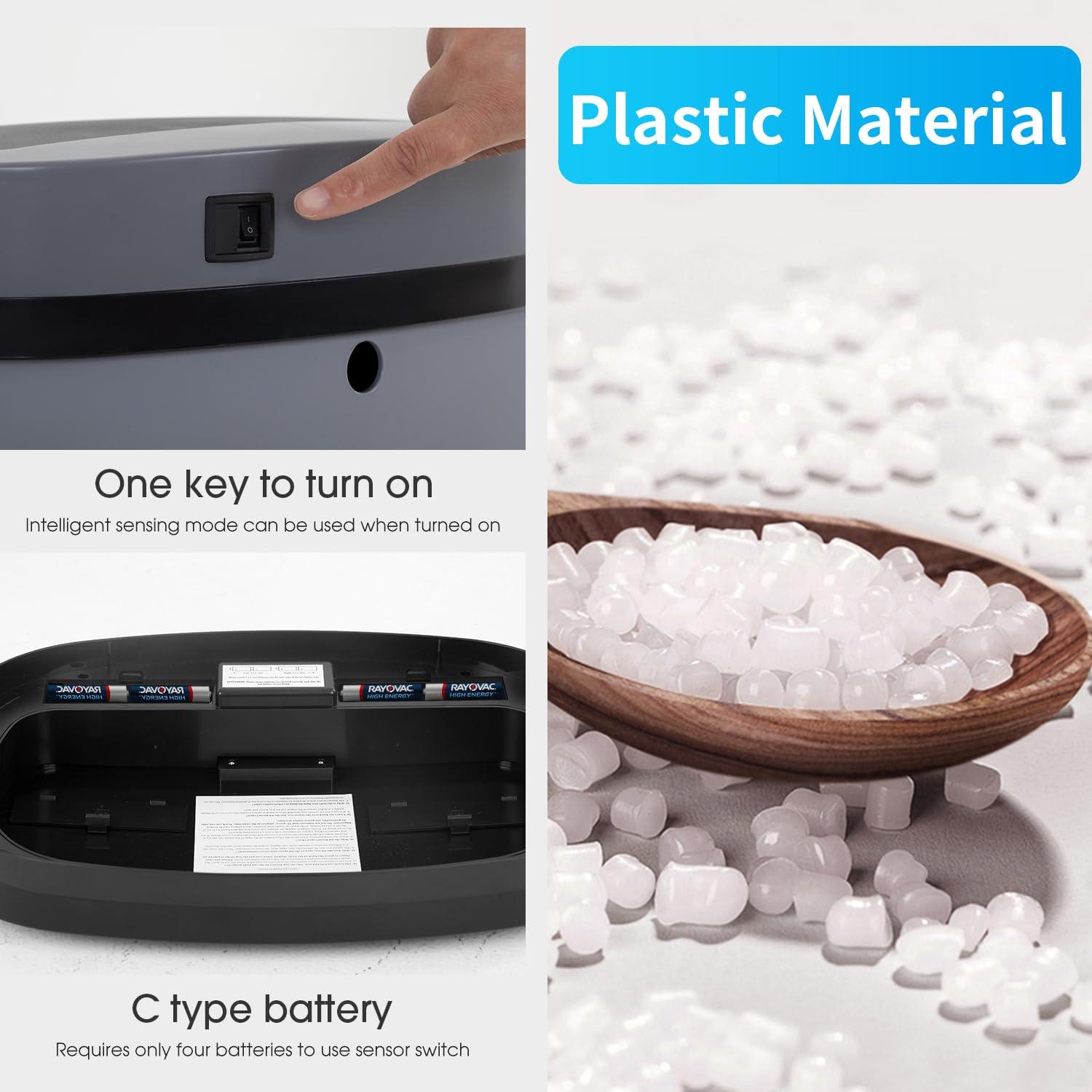The high-quality stainless steel body is fingerprint-resistant and easy to clean—just wipe with a dry towel. To ensure long-lasting performance, place the trash can in a cool, dry, ventilated area to protect electronic components. Powered by 4 C batteries, it delivers up to 40,000 openings for long-lasting use. Alkaline batteries are recommended for best performance. Clear guidance on proper battery installation and switch usage prevents setup issues.