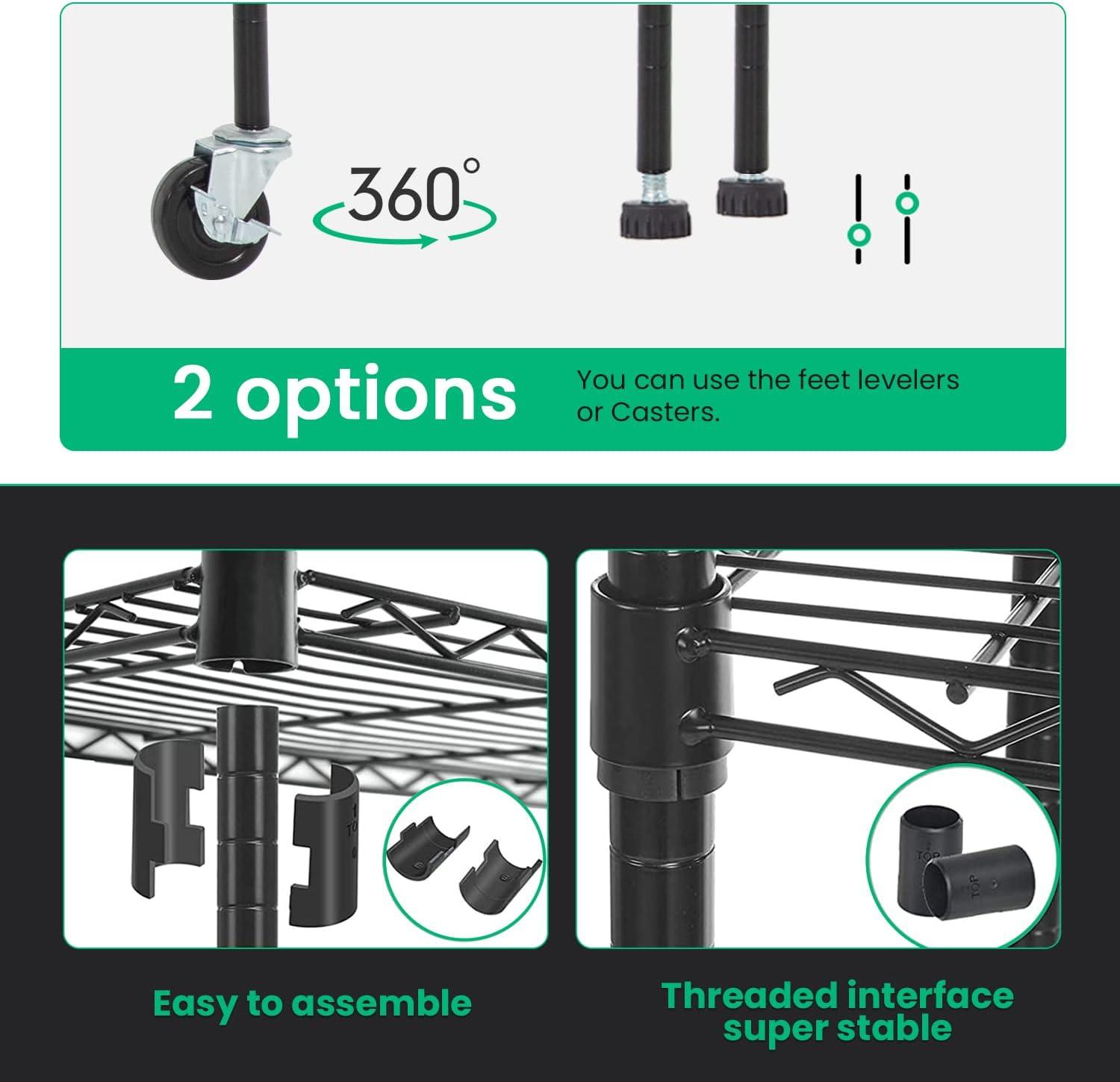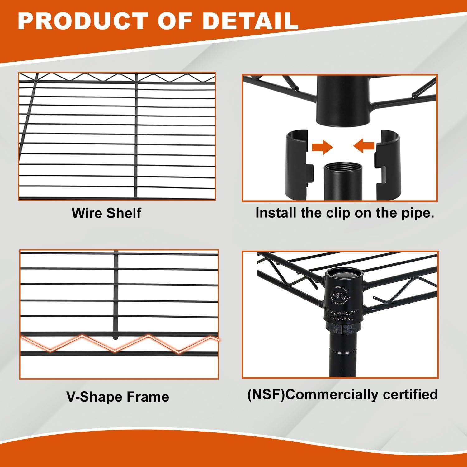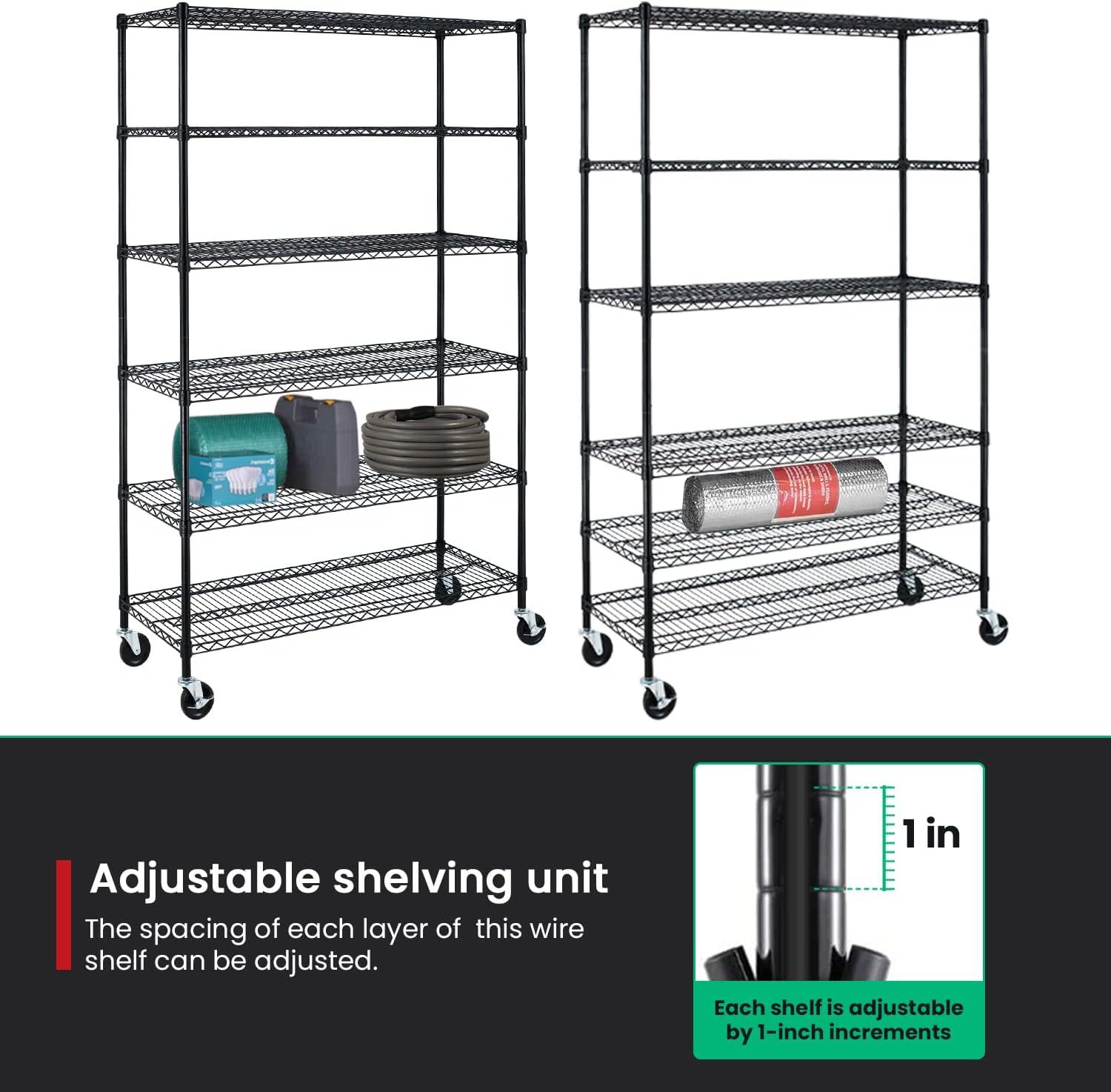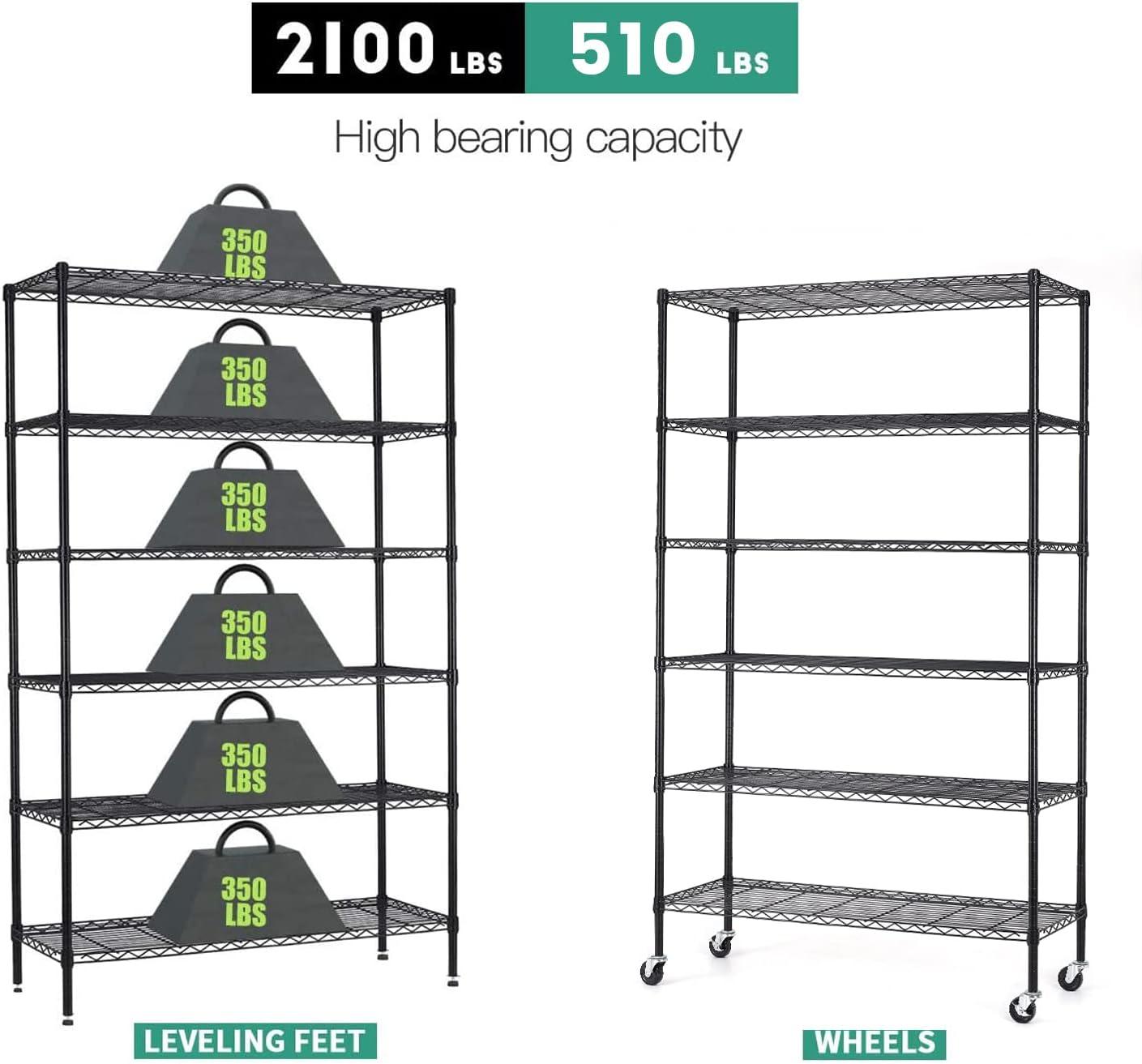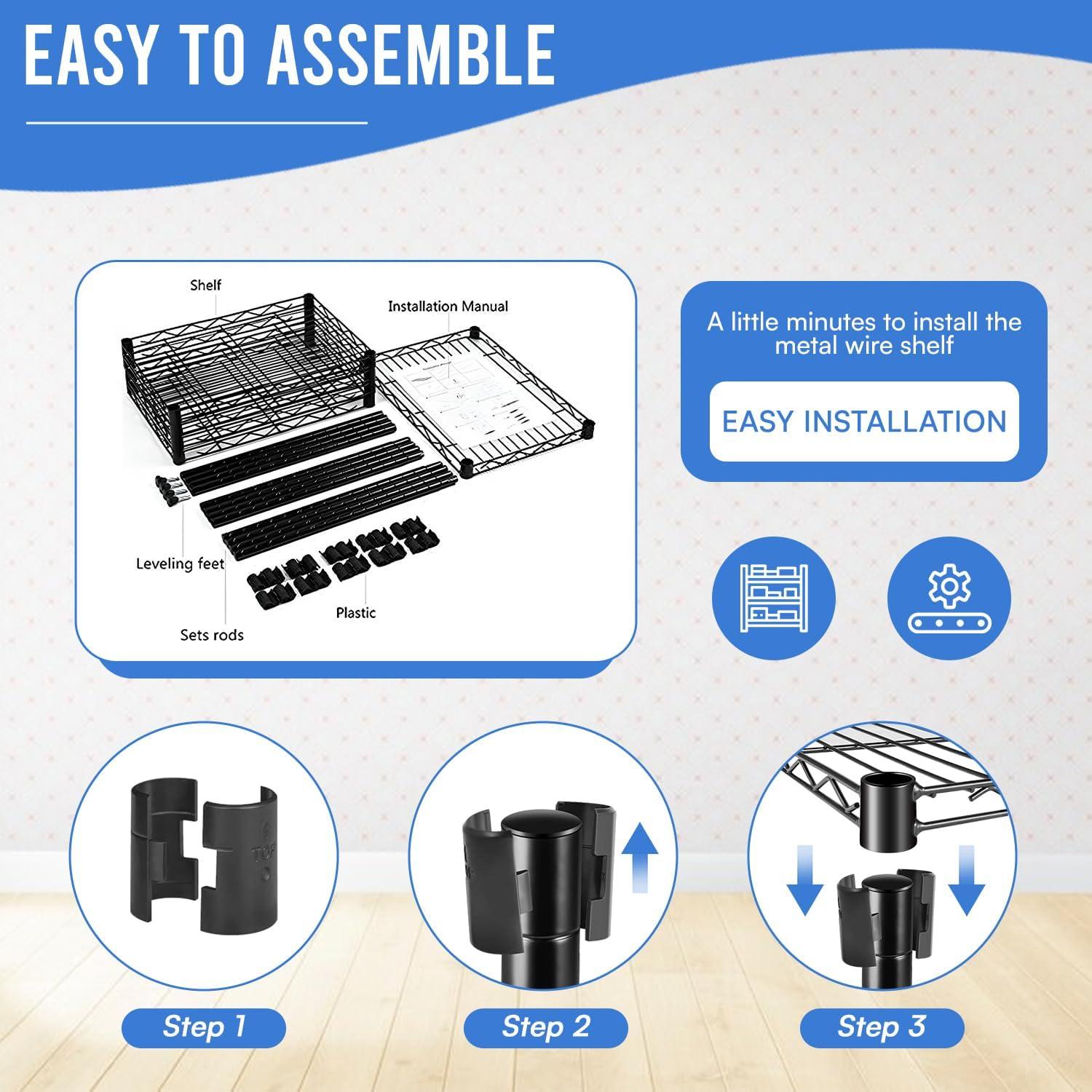 This is 6 tier commercial grade wire shelf,you only need to spend 15min to install it.The shelving unit is made of steel wire shelving.Maximum weight capacity per shelf is 220lbs when equally distributed on feet levelers.Maximum entire unit weight capacity is 500lbs when equally distributed on casters.You can use the feet levelers or wheels to suit your needs.The storage rack provide an enormous amount of space for you.You can use this wire shelving in the kitchen bedroom garage Large commercial warehouse.