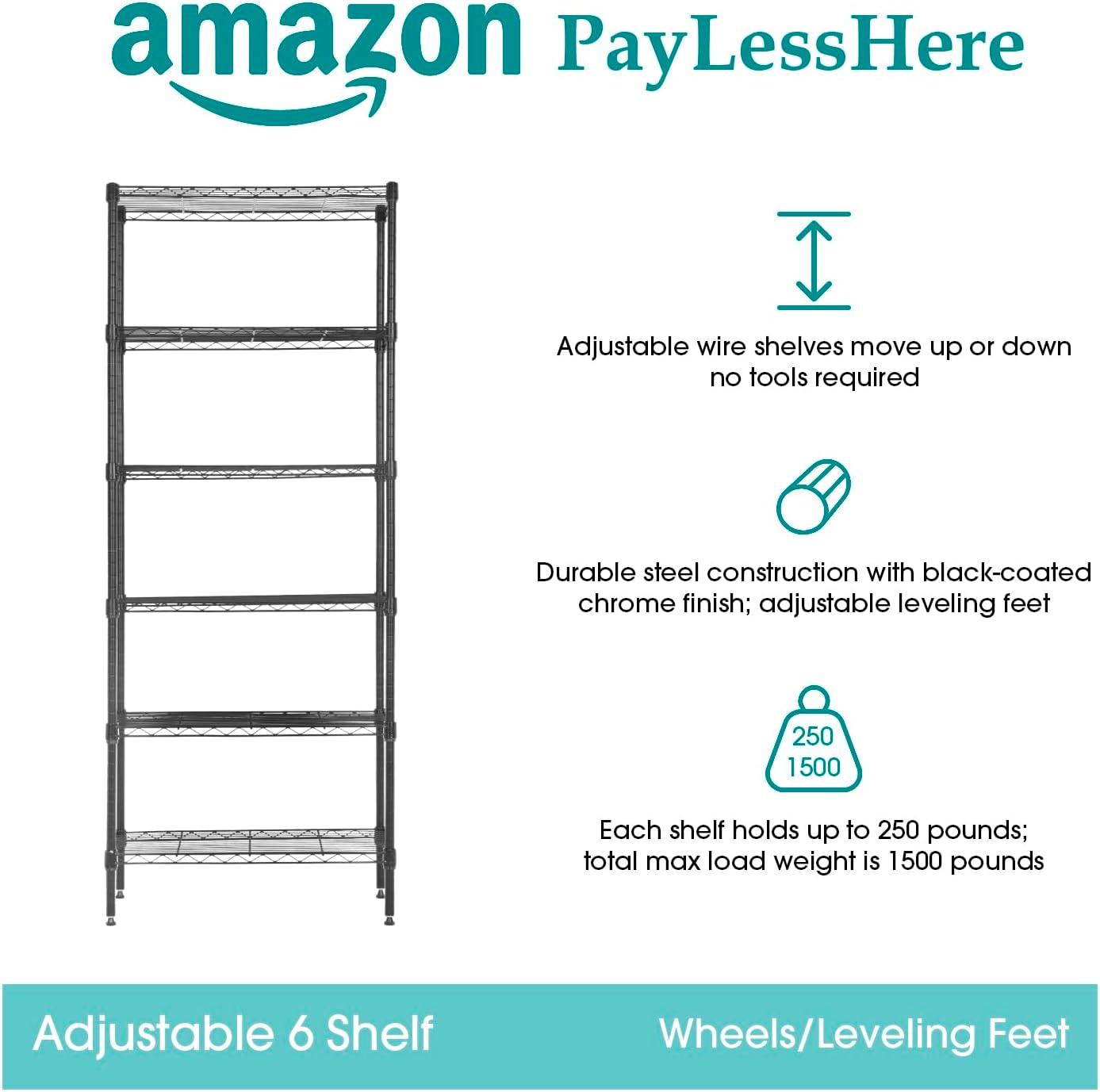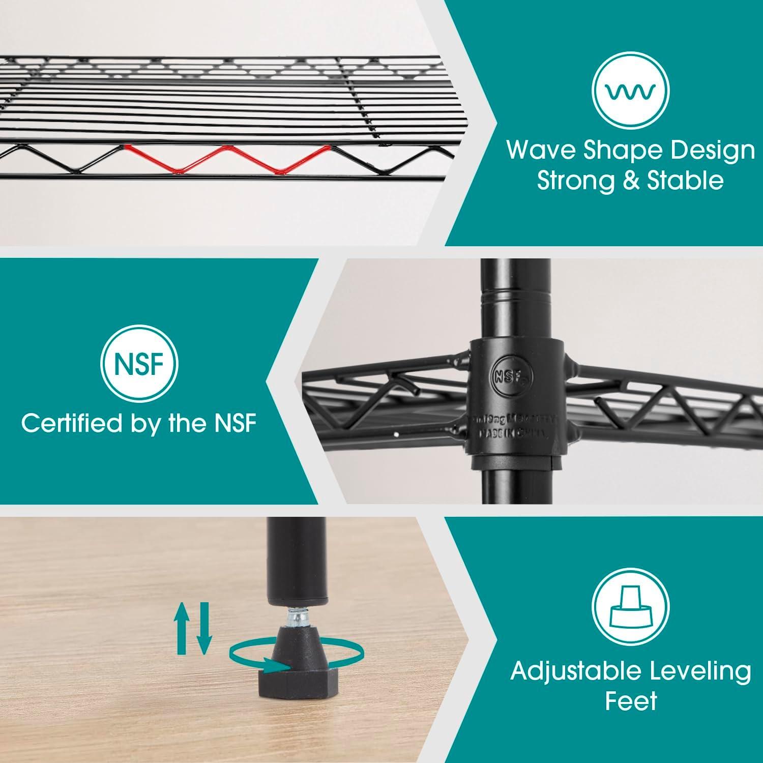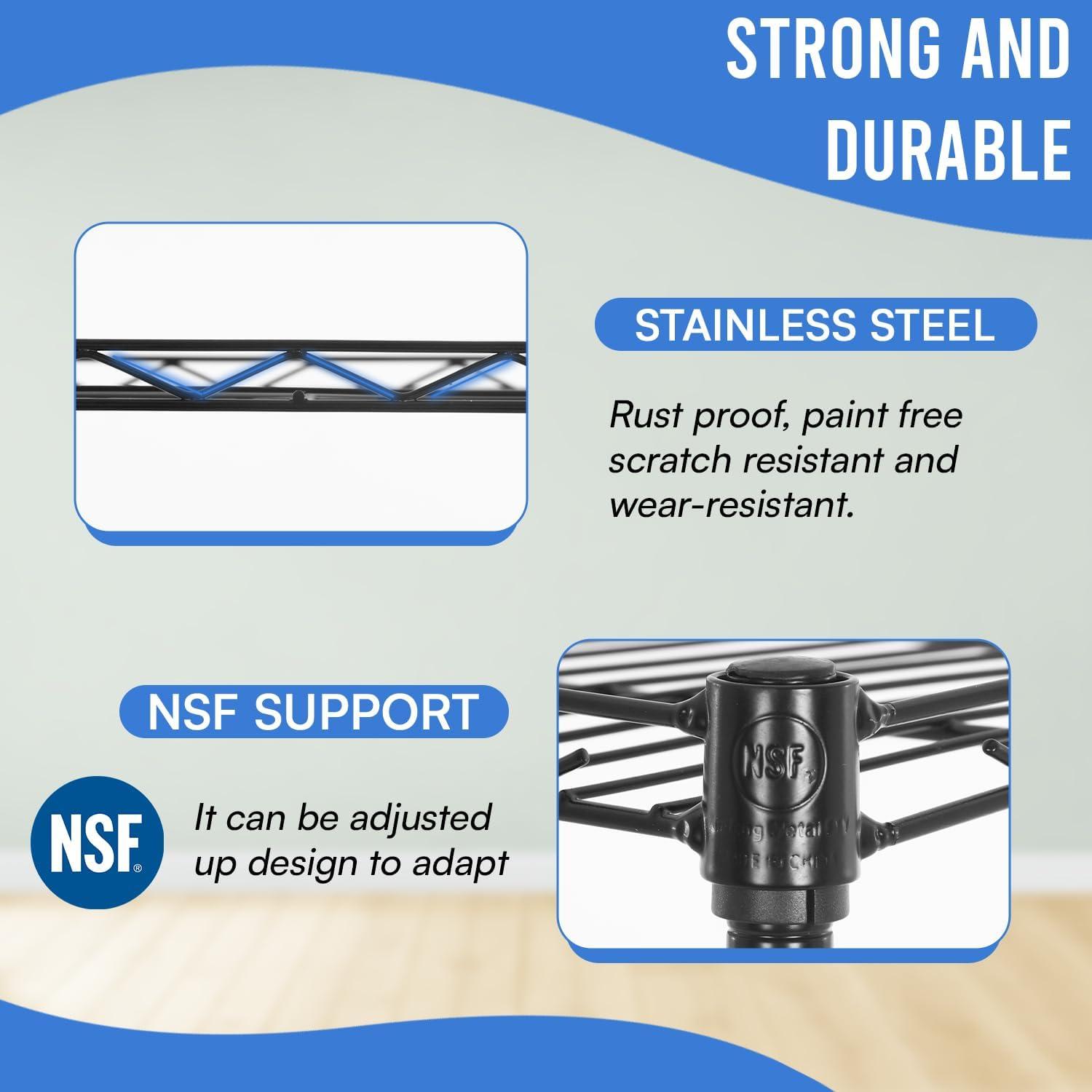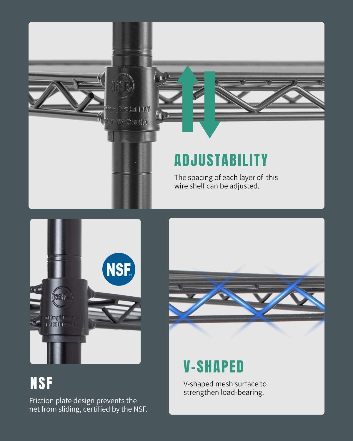 This is 6 tier commercial grade wire shelf,you only need to spend 15min to install it.The shelving unit is made of steel wire shelving.Maximum weight capacity per shelf is 220lbs when equally distributed on feet levelers.Maximum entire unit weight capacity is 500lbs when equally distributed on casters.You can use the feet levelers or wheels to suit your needs.The storage rack provide an enormous amount of space for you.You can use this wire shelving in the kitchen bedroom garage Large commercial warehouse.