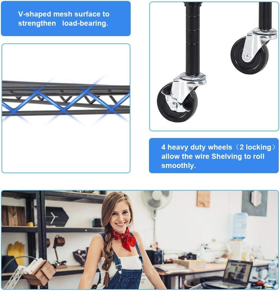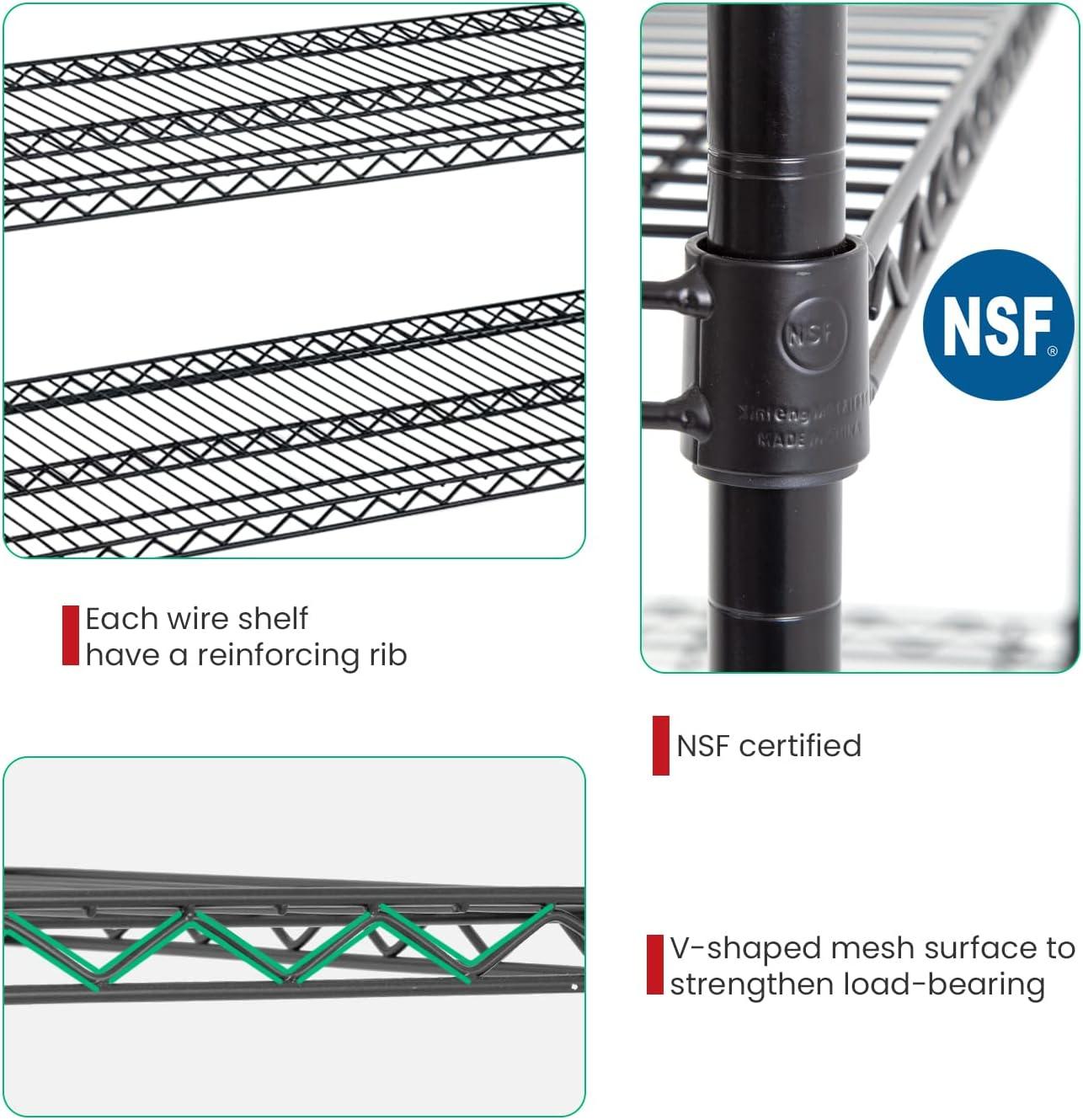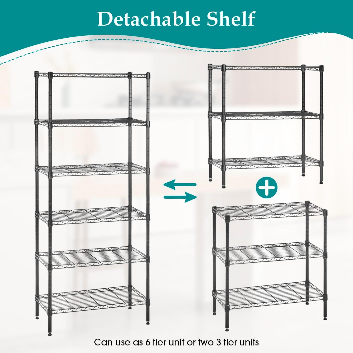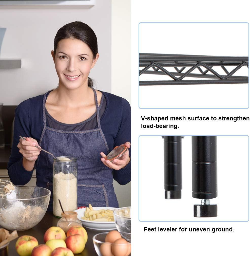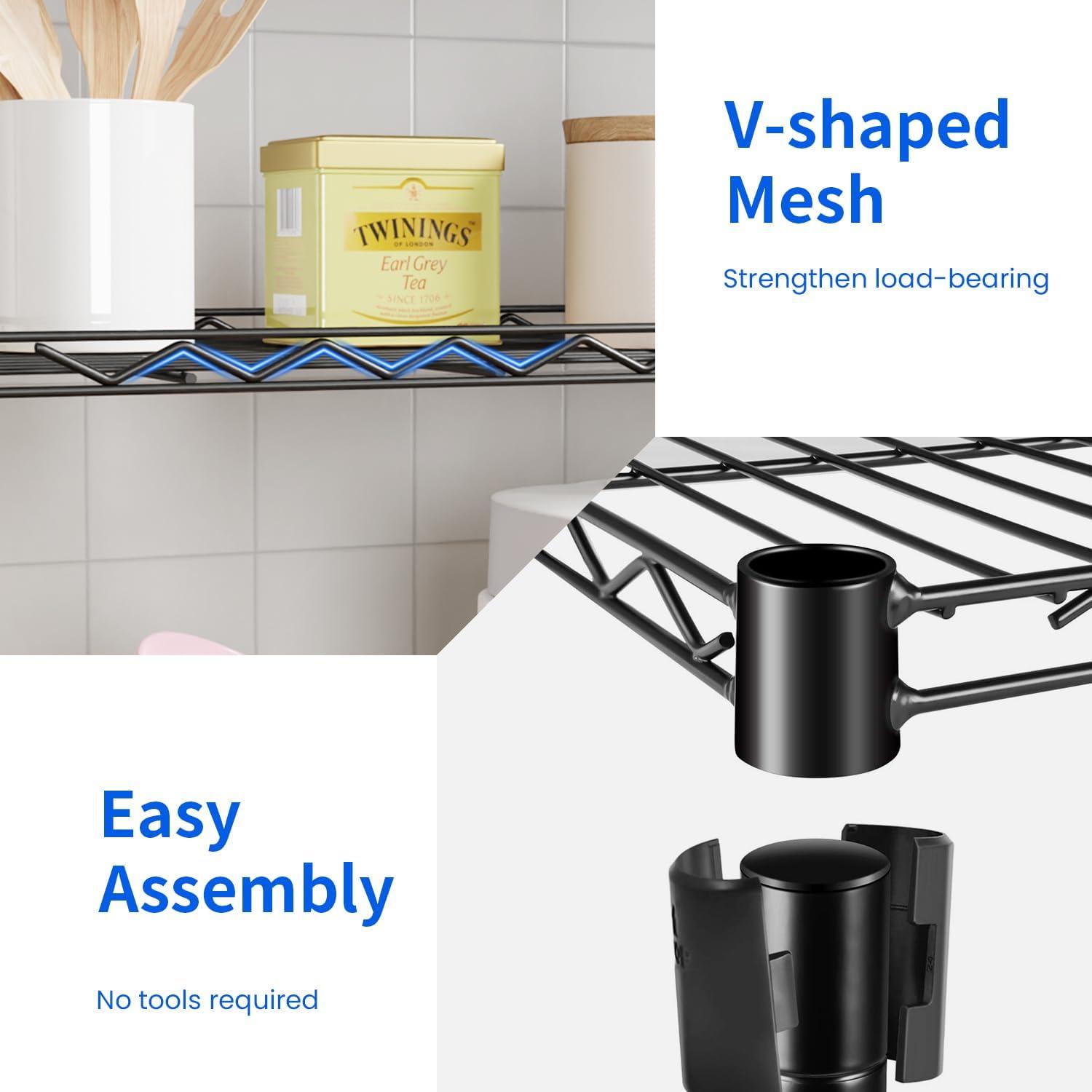 This is 6 tier commercial grade wire shelf,you only need to spend 15min to install it.The shelving unit is made of steel wire shelving.Maximum weight capacity per shelf is 220lbs when equally distributed on feet levelers.Maximum entire unit weight capacity is 500lbs when equally distributed on casters.You can use the feet levelers or wheels to suit your needs.The storage rack provide an enormous amount of space for you.You can use this wire shelving in the kitchen bedroom garage Large commercial warehouse.