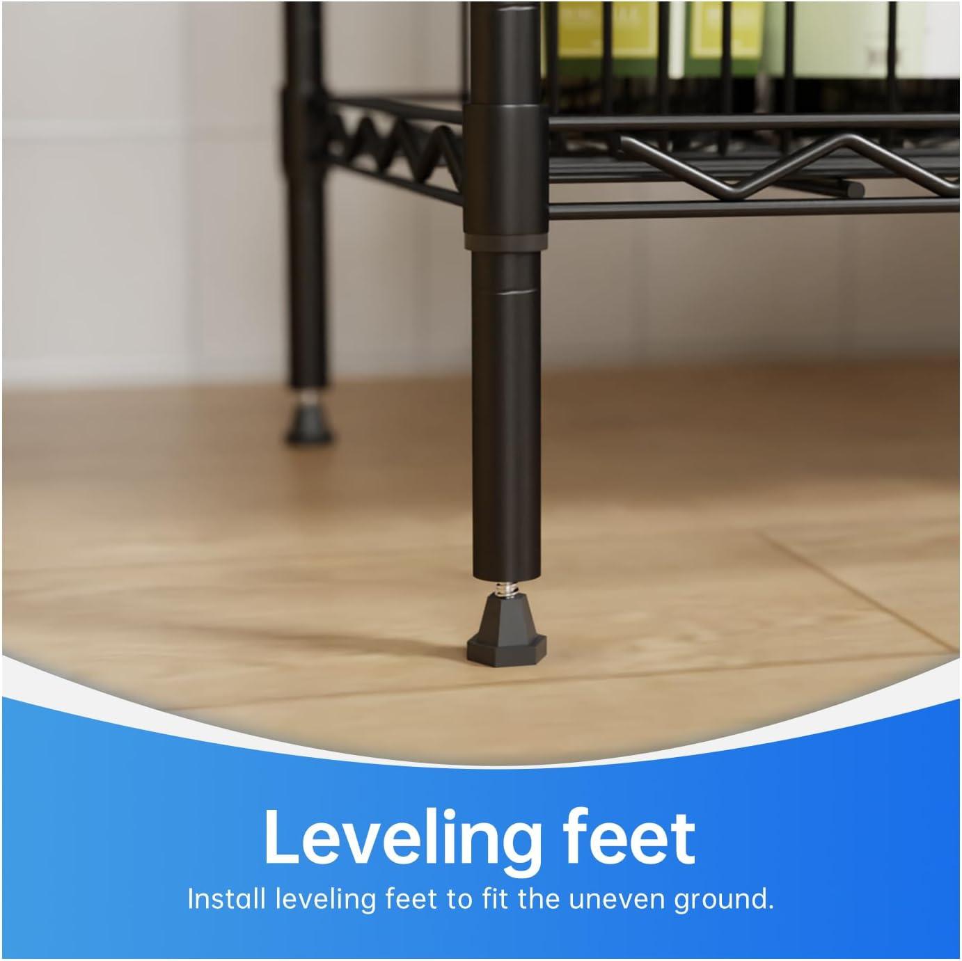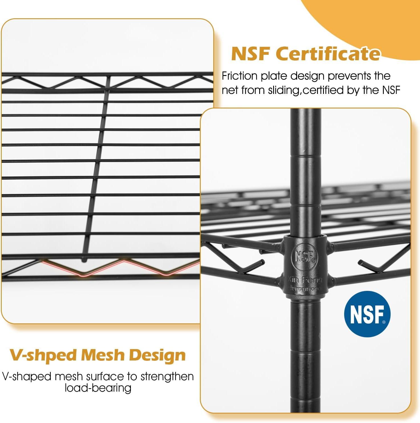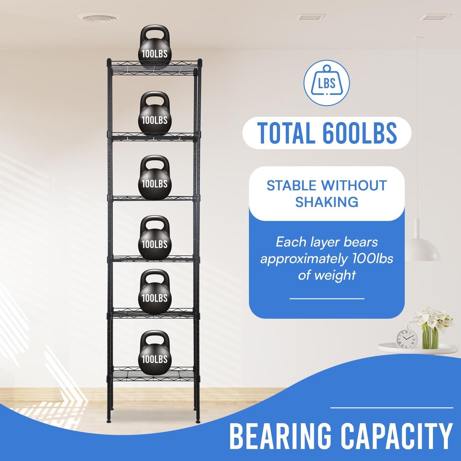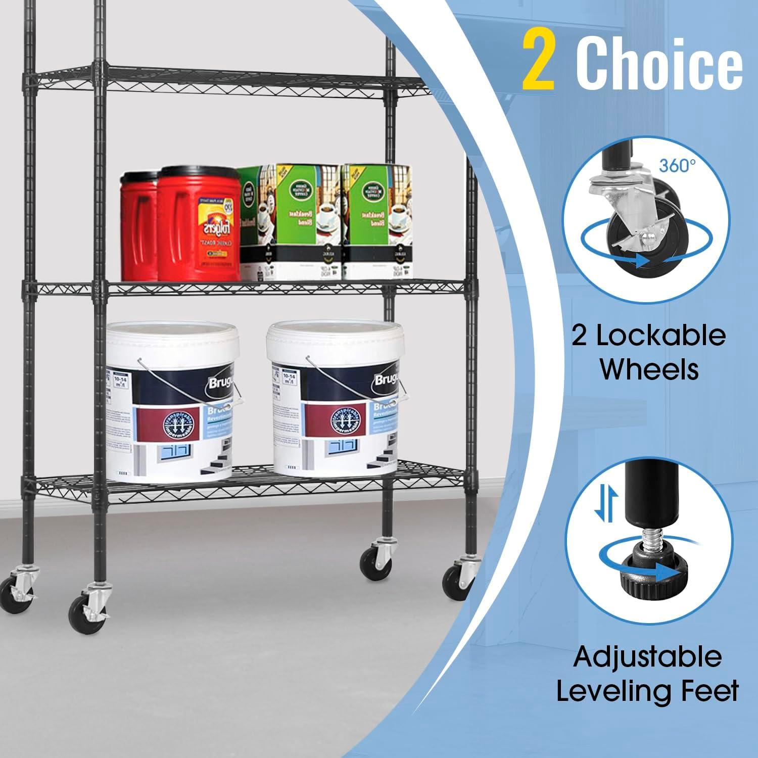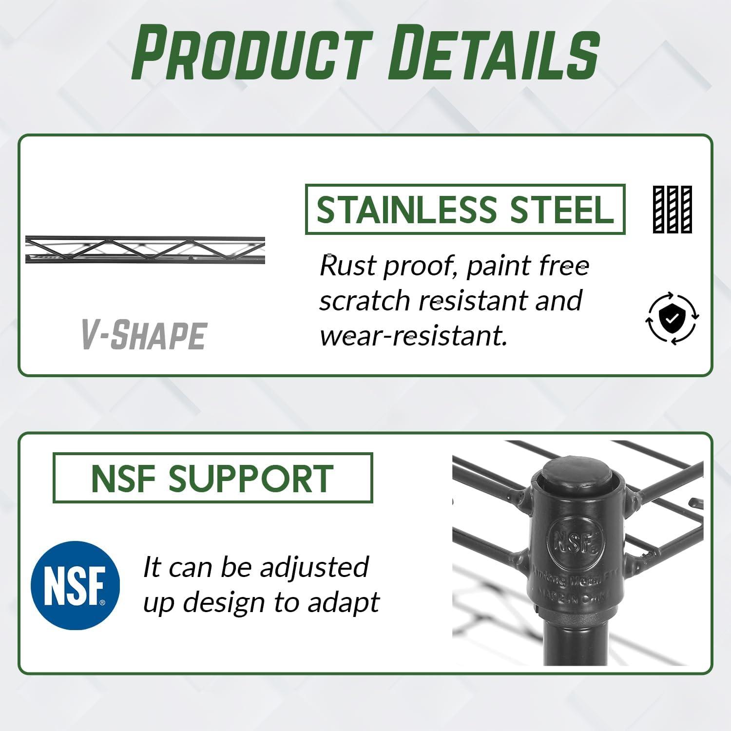 This is 6 tier commercial grade wire shelf,you only need to spend 15min to install it.The shelving unit is made of steel wire shelving.Maximum weight capacity per shelf is 220lbs when equally distributed on feet levelers.Maximum entire unit weight capacity is 500lbs when equally distributed on casters.You can use the feet levelers or wheels to suit your needs.The storage rack provide an enormous amount of space for you.You can use this wire shelving in the kitchen bedroom garage Large commercial warehouse.