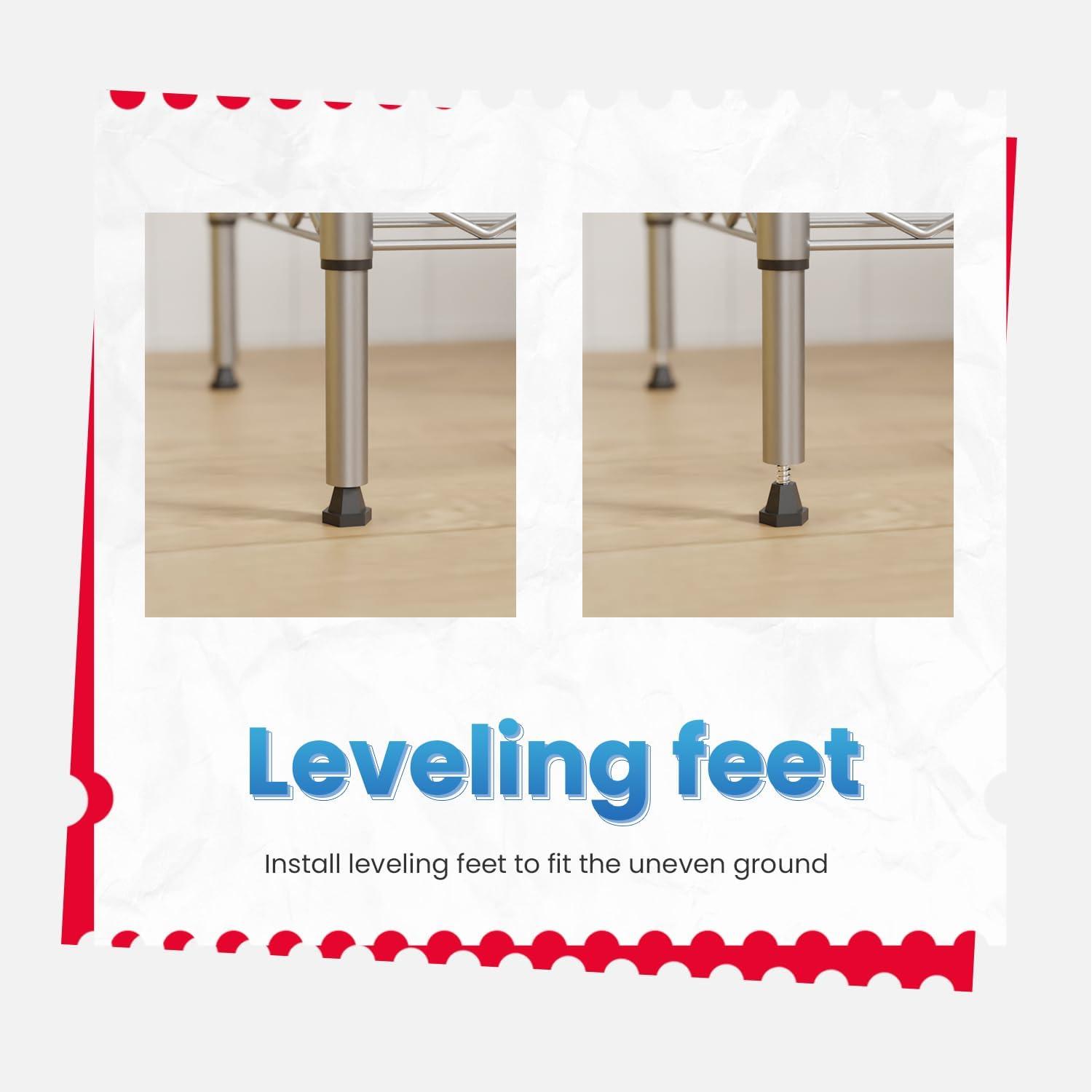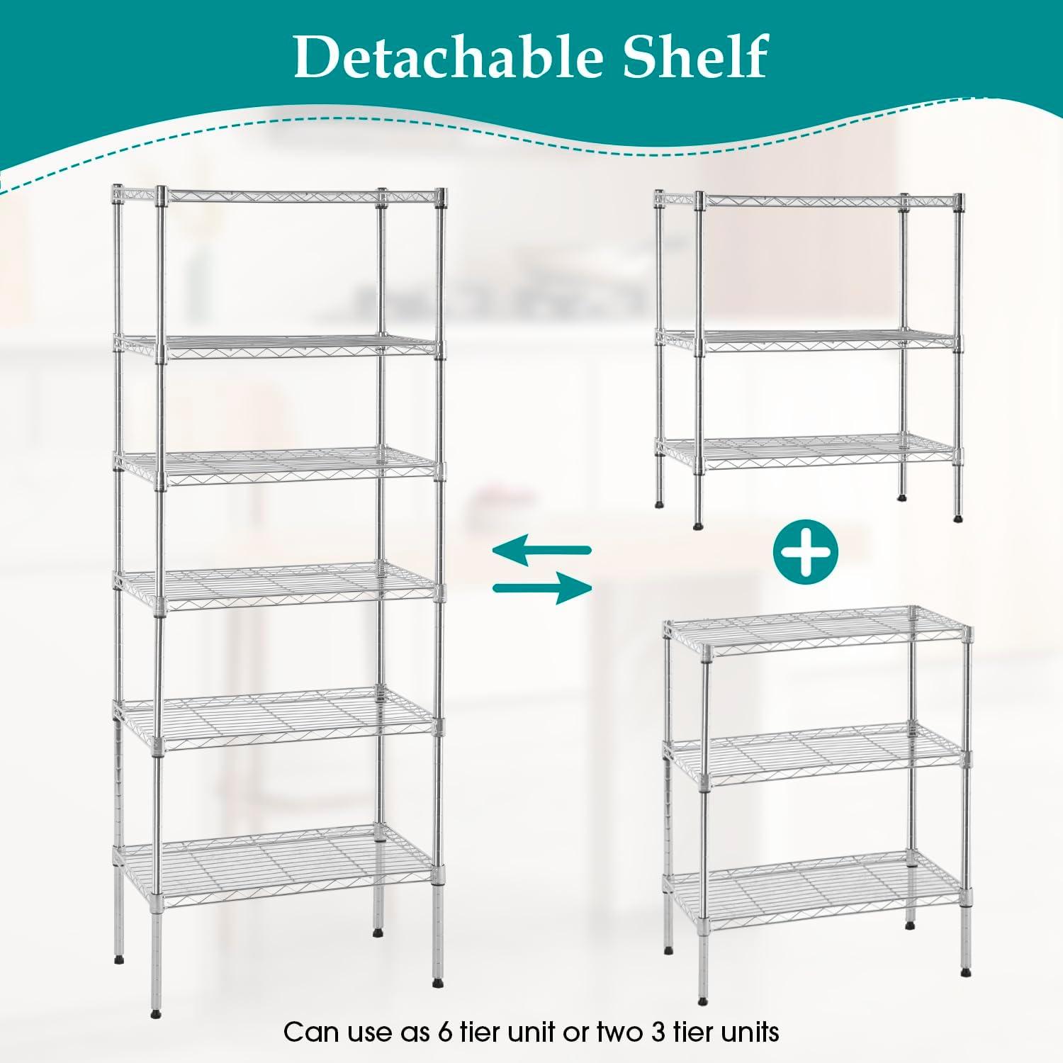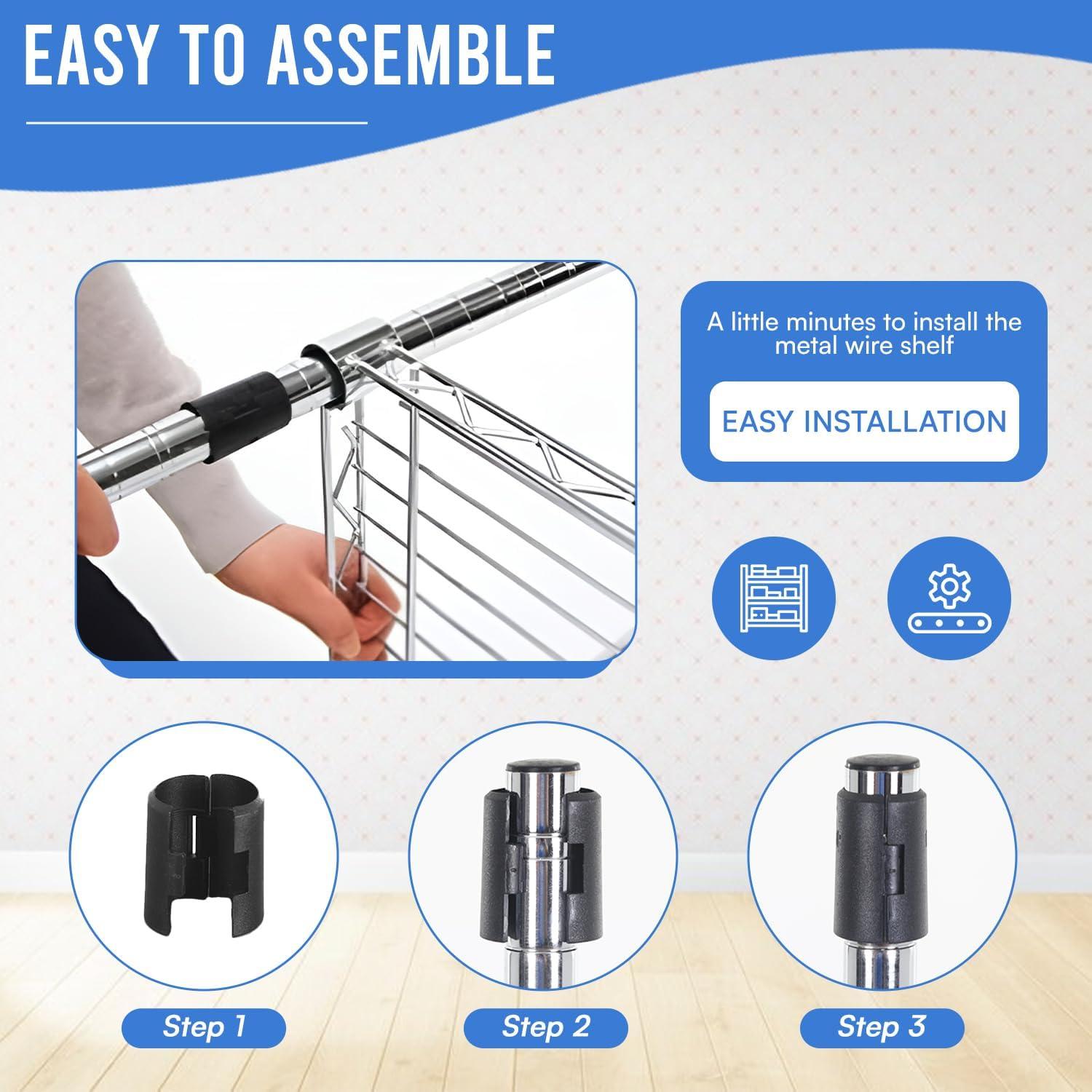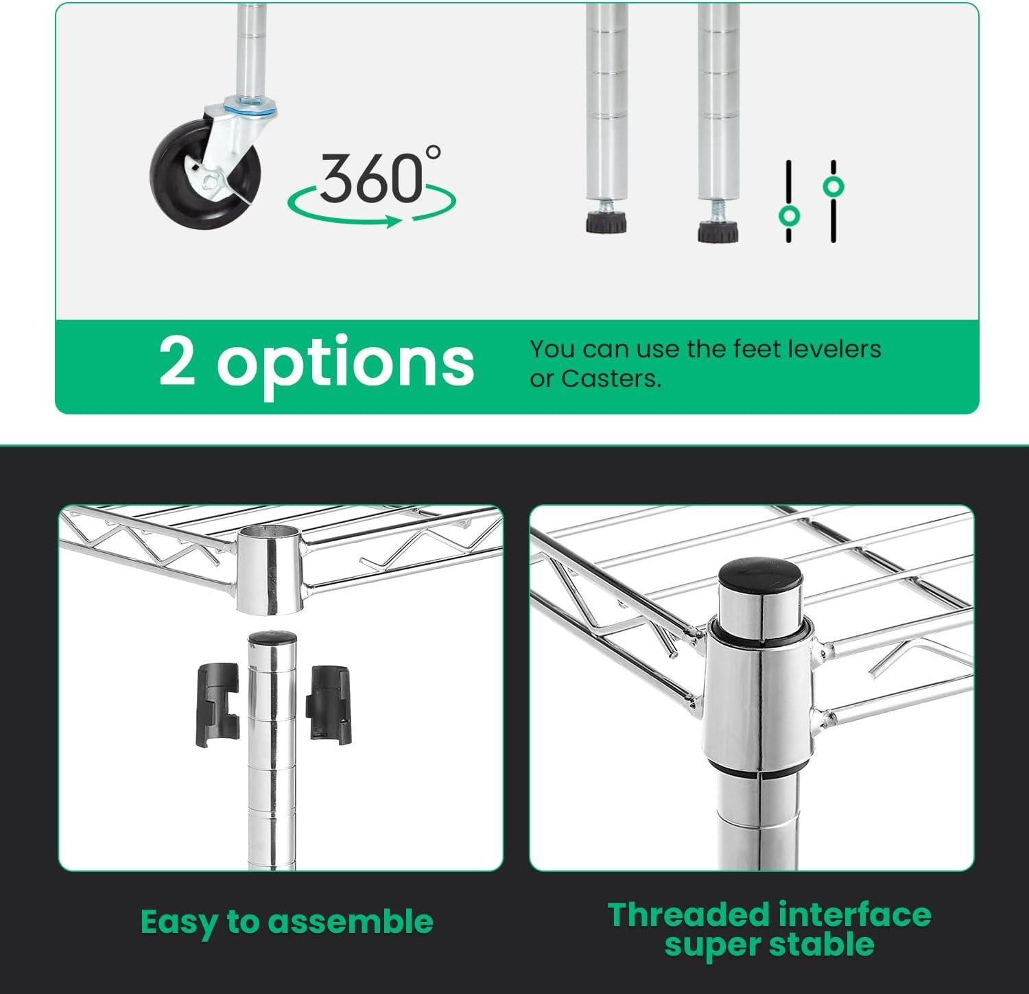 This is 6 tier commercial grade wire shelf,you only need to spend 15min to install it.The shelving unit is made of steel wire shelving.Maximum weight capacity per shelf is 220lbs when equally distributed on feet levelers.Maximum entire unit weight capacity is 500lbs when equally distributed on casters.You can use the feet levelers or wheels to suit your needs.The storage rack provide an enormous amount of space for you.You can use this wire shelving in the kitchen bedroom garage Large commercial warehouse.
