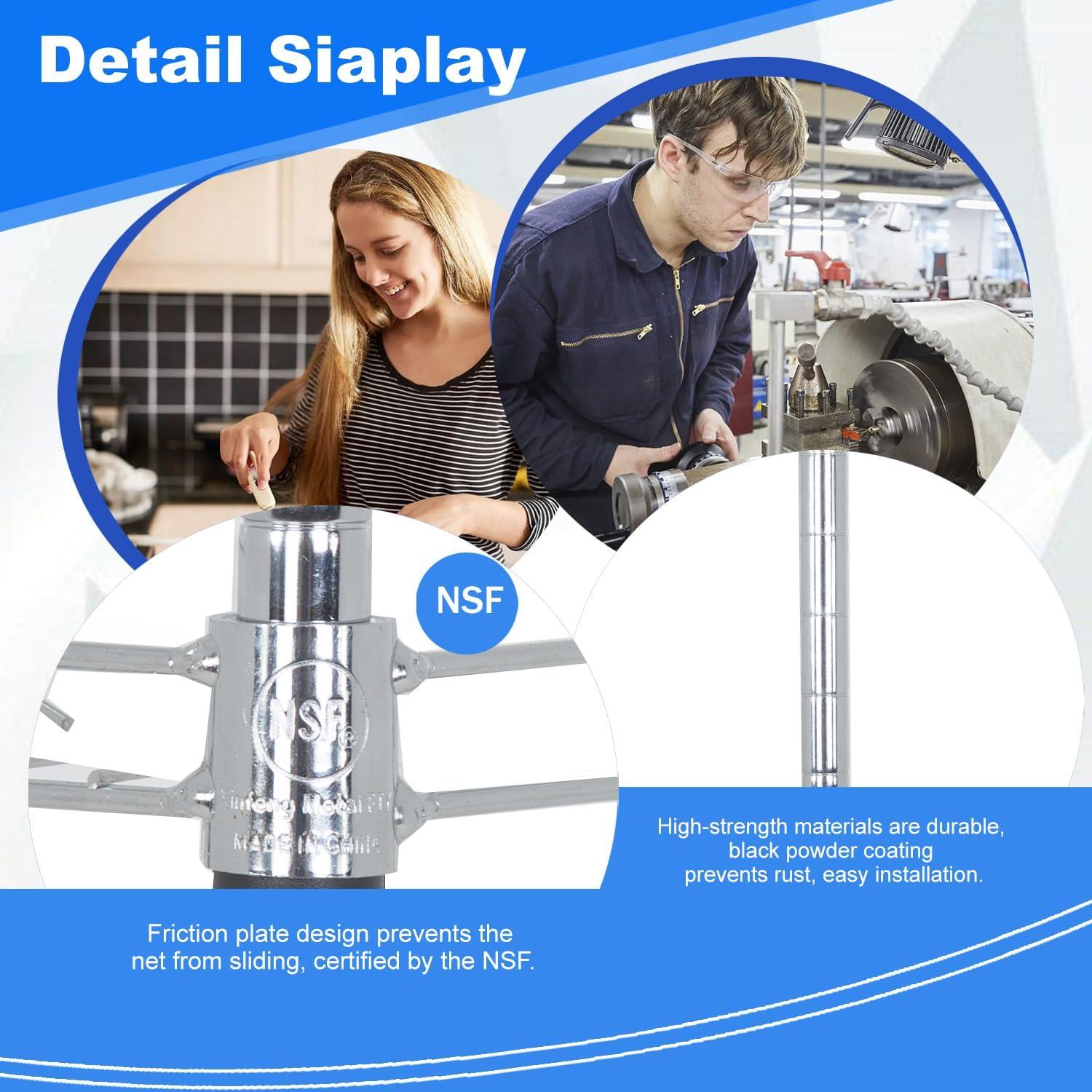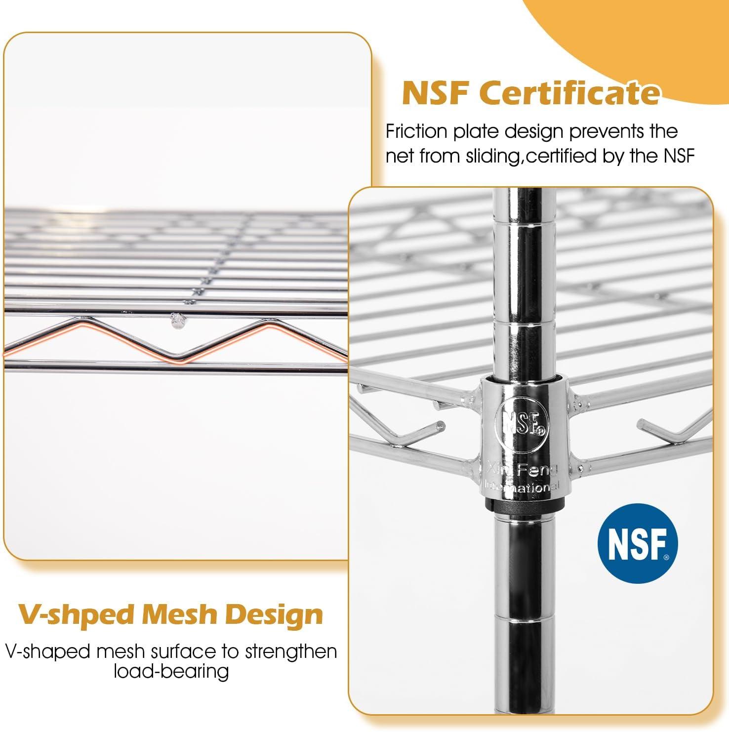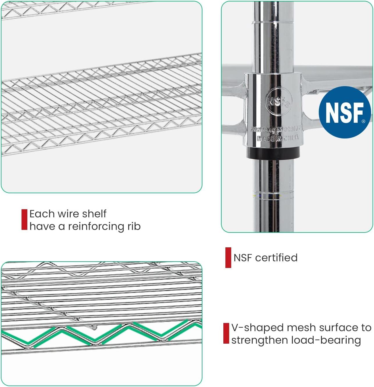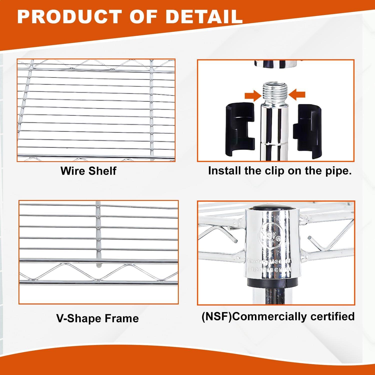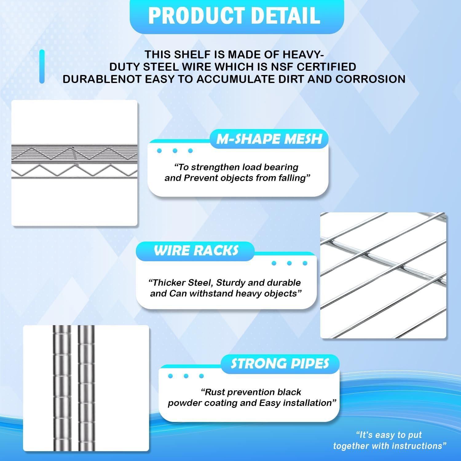 This is 6 tier commercial grade wire shelf,you only need to spend 15min to install it.The shelving unit is made of steel wire shelving.Maximum weight capacity per shelf is 220lbs when equally distributed on feet levelers.Maximum entire unit weight capacity is 500lbs when equally distributed on casters.You can use the feet levelers or wheels to suit your needs.The storage rack provide an enormous amount of space for you.You can use this wire shelving in the kitchen bedroom garage Large commercial warehouse.