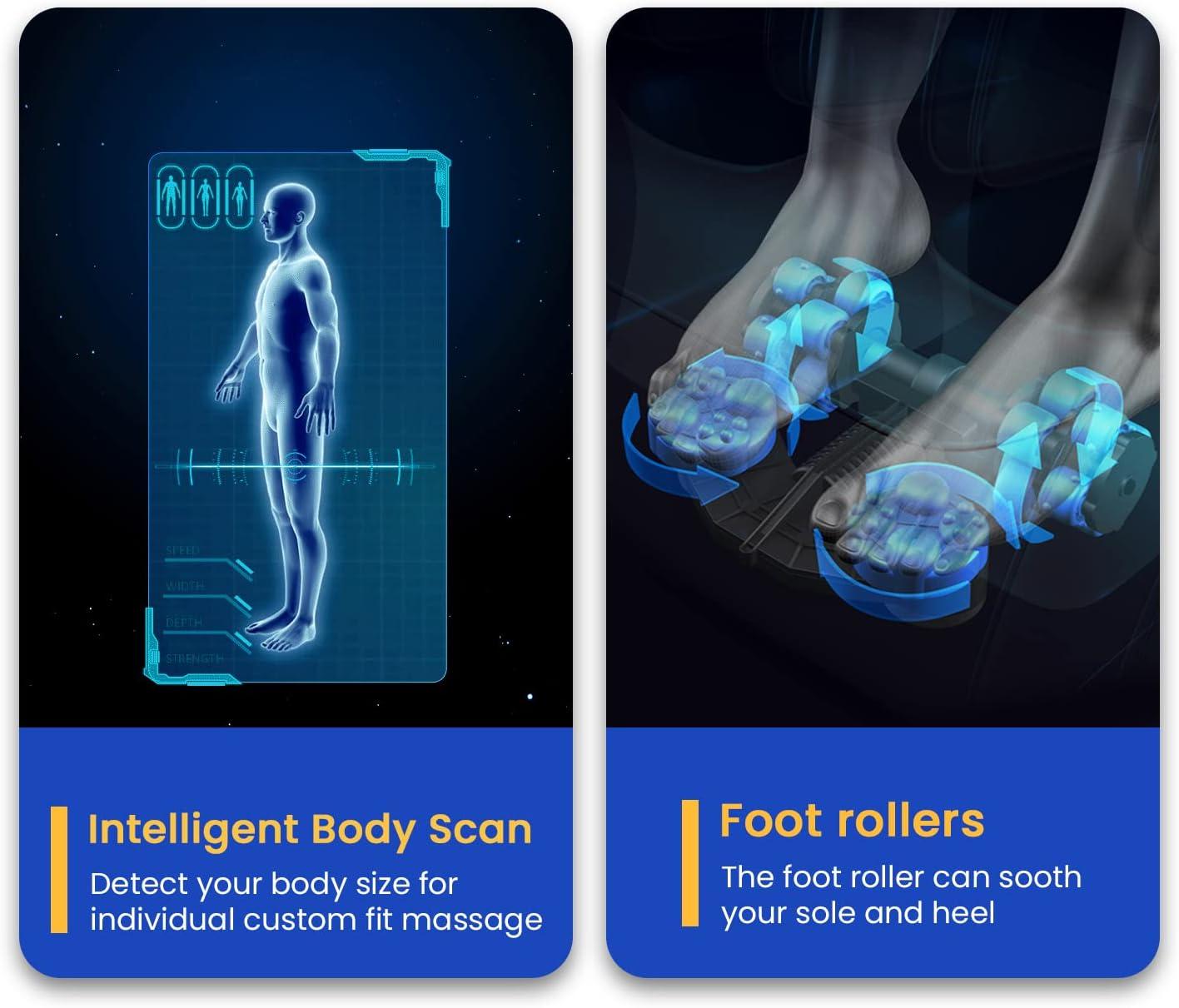 【COMPUTERIZED BODY SCANNING】:Smart body scan technology scans your body to detect your body size for individual custom fit massage.Built-in sensor automatically measure the length of spine and knows where to massage. 11 signal tset switch and holt sensor work tegther to test user’s body height and up/down distance of massage machine for massage range.Automatically adjust massage intensity according to user’s body weight.Allow the massage chair to fit perfectly different figure.