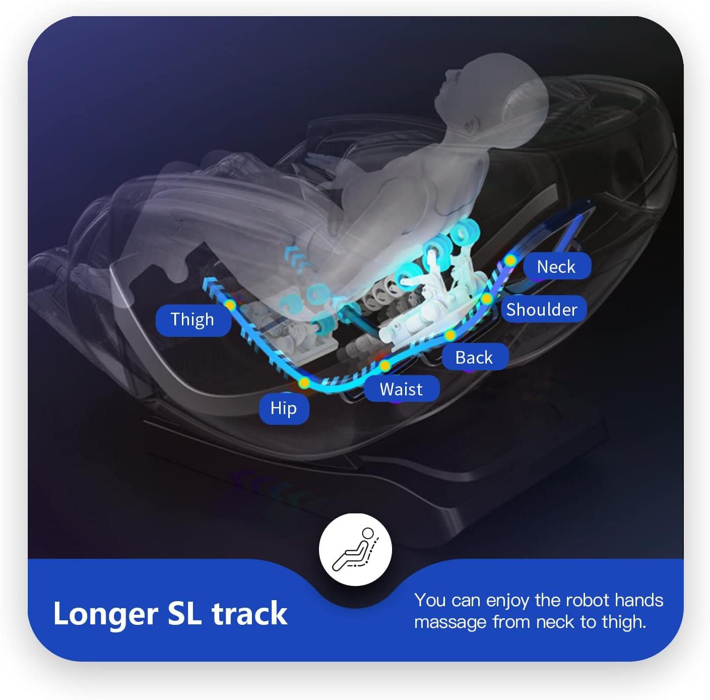 SL-track pushes the chair's rollers from head to thighs, ensuring that you receive a full-body massage; Robot Hands inside of the backrest work with SL-TRACK provide a complete massage to comfort and relax you from head to thighs. Our robot-hand rollers have up to 8 different massage techniques.