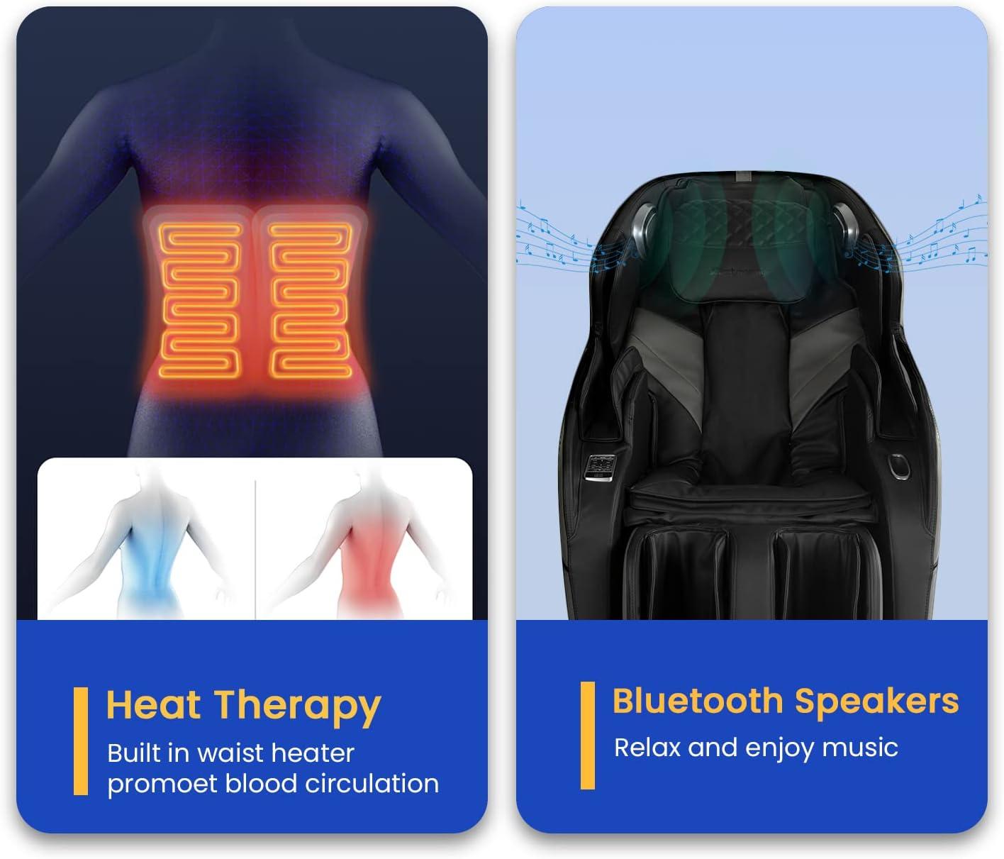 【Zero-gravity Technique & Blue-tooth Speaker】Zero Gravity is when your body under the most natural and complete relax position, legs are a little higher than heart. Multiple Zero Gravity: zero gravity floating experience, feel virtually weightless. Zero Gravity can effectively reduce heart pressure and stimulate blood circulation. Blue-tooth Speaker support you to listen to your favorite music while enjoying massage.